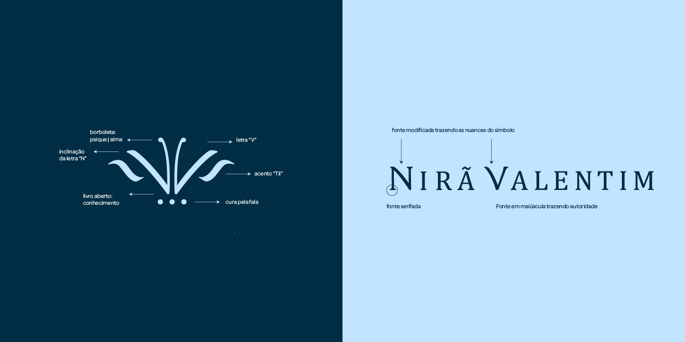 The symbol was designed to communicate the various activities developed by Nirã, as well as the pillars of her work: a book - referring to knowledge, study, and wisdom; the three dots - to communicate healing through speech; and finally, the butterfly - representing the psyche and the soul.